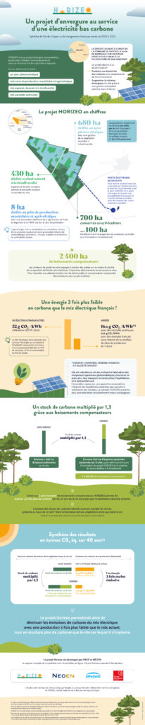 - Avec un reboisement diversifié (pins maritime et feuillus) de 2 400 ha (objectif que se sont fixés ENGIE et NEOEN), le projet Horizeo permet de stocker environ 1,3 fois plus de carbone que le site de l’aire d’étude aujourd’hui exploité pour le bois.